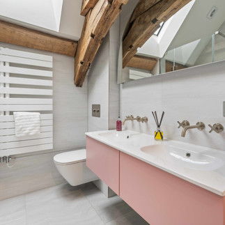 A standout feature of the renovation is a newly added loft space, comprising two bedrooms and a bathroom, seamlessly integrated into the existing structure. The project team retained the original, oversized oak trusses, which now frame the loft with rustic character and grandeur.